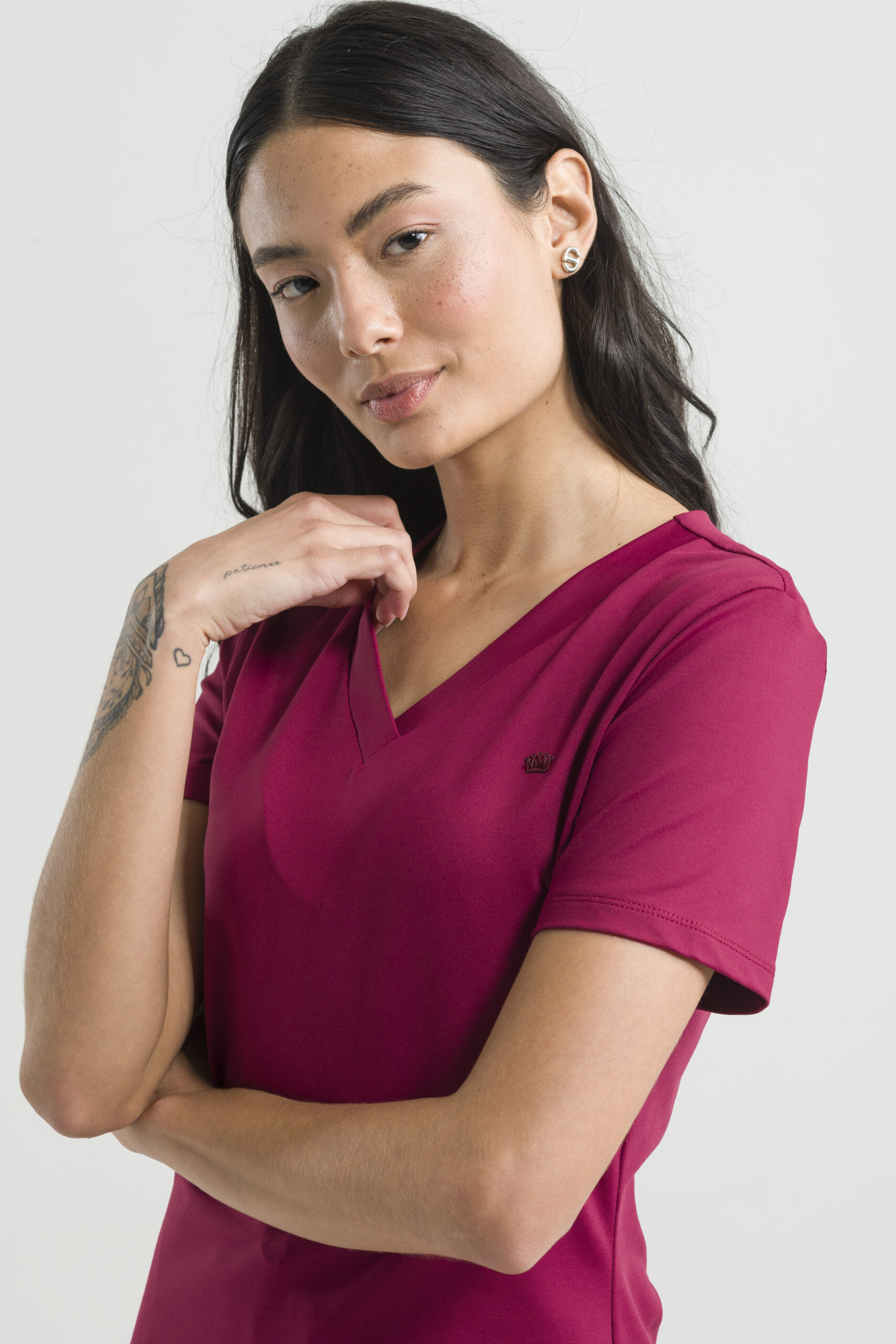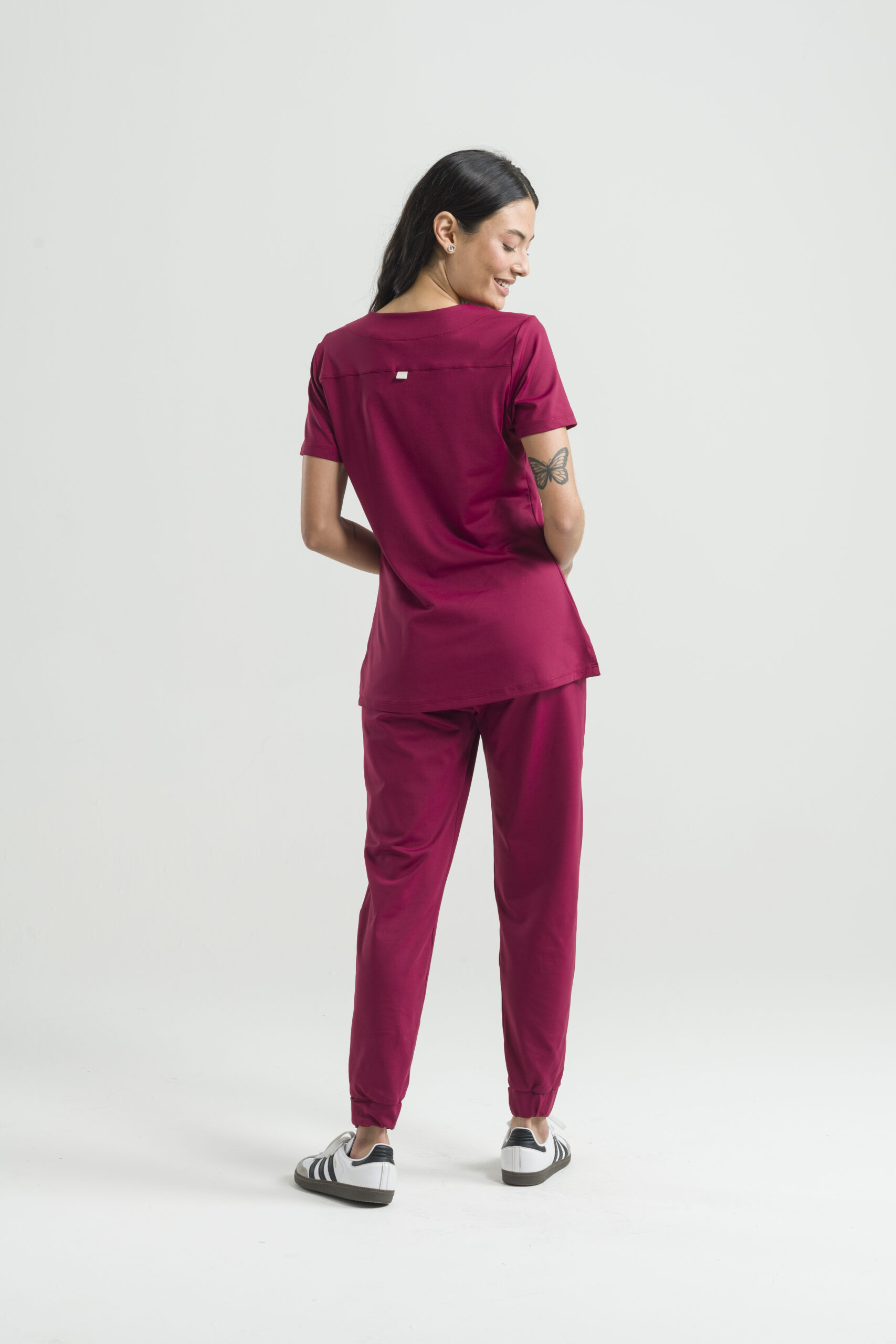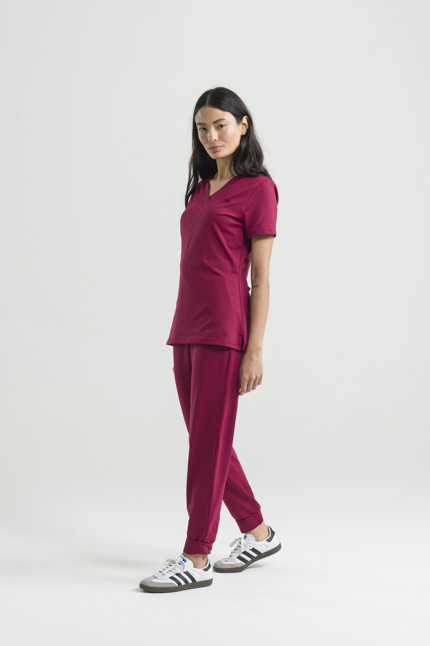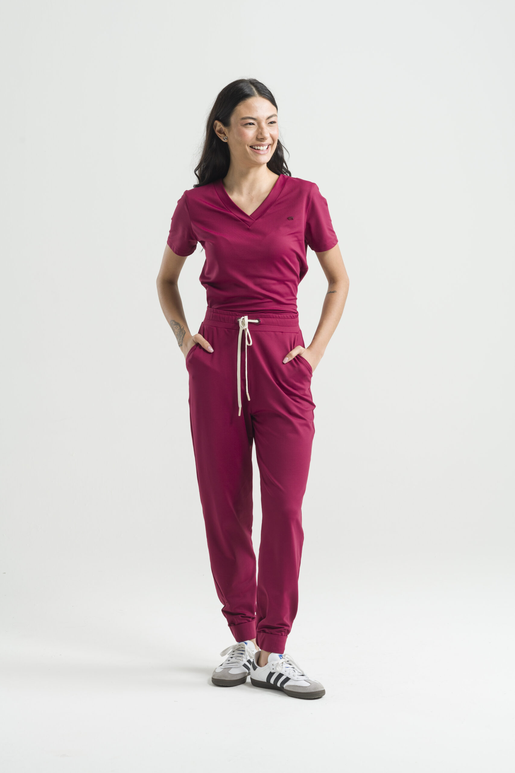 Presenta un diseño básico, con blusa de cuello en V y manga corta, y pantalones con cinturilla elástica con cordón ajustable, bolsillos laterales y tobillos ajustables.