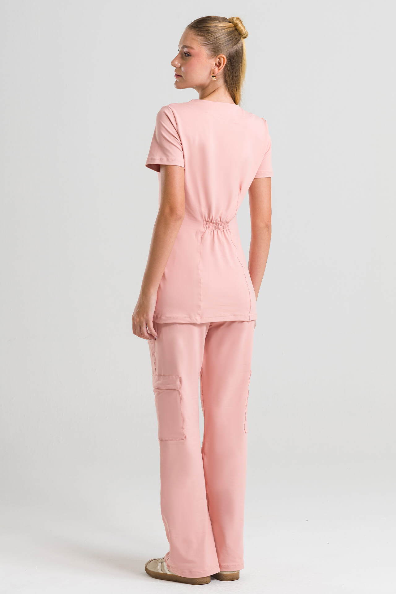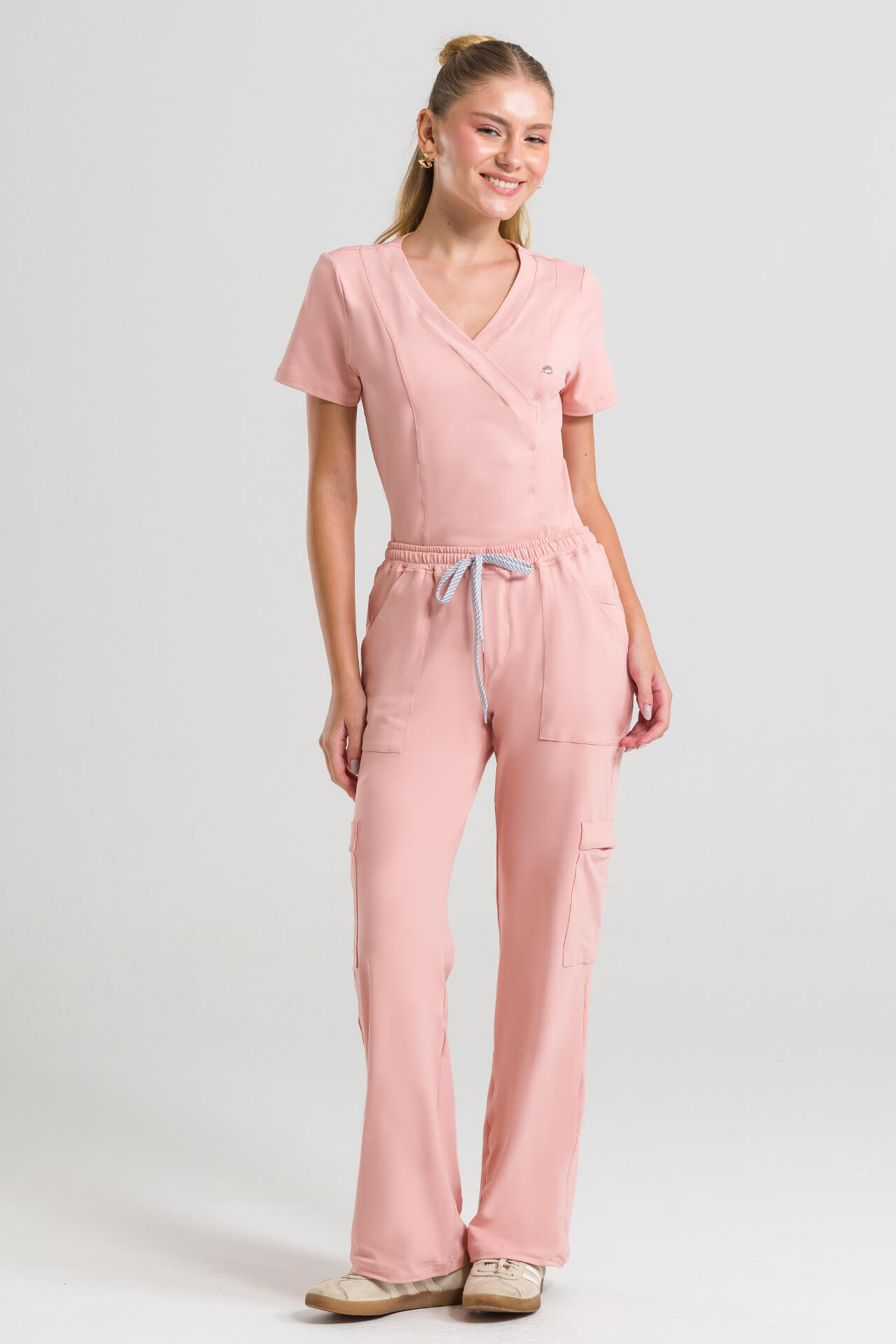 El modelado deportivo fue diseñado para un ajuste perfecto al cuerpo, realzando un aspecto moderno y profesional. El escote en V y los bolsillos inferiores de la blusa garantizan funcionalidad y estilo. Los pantalones completan el conjunto con 9 BOLSILLOS UTILITY delanteros y traseros, así como un ajuste cómodo con cinturilla elástica y cierre con cordones.