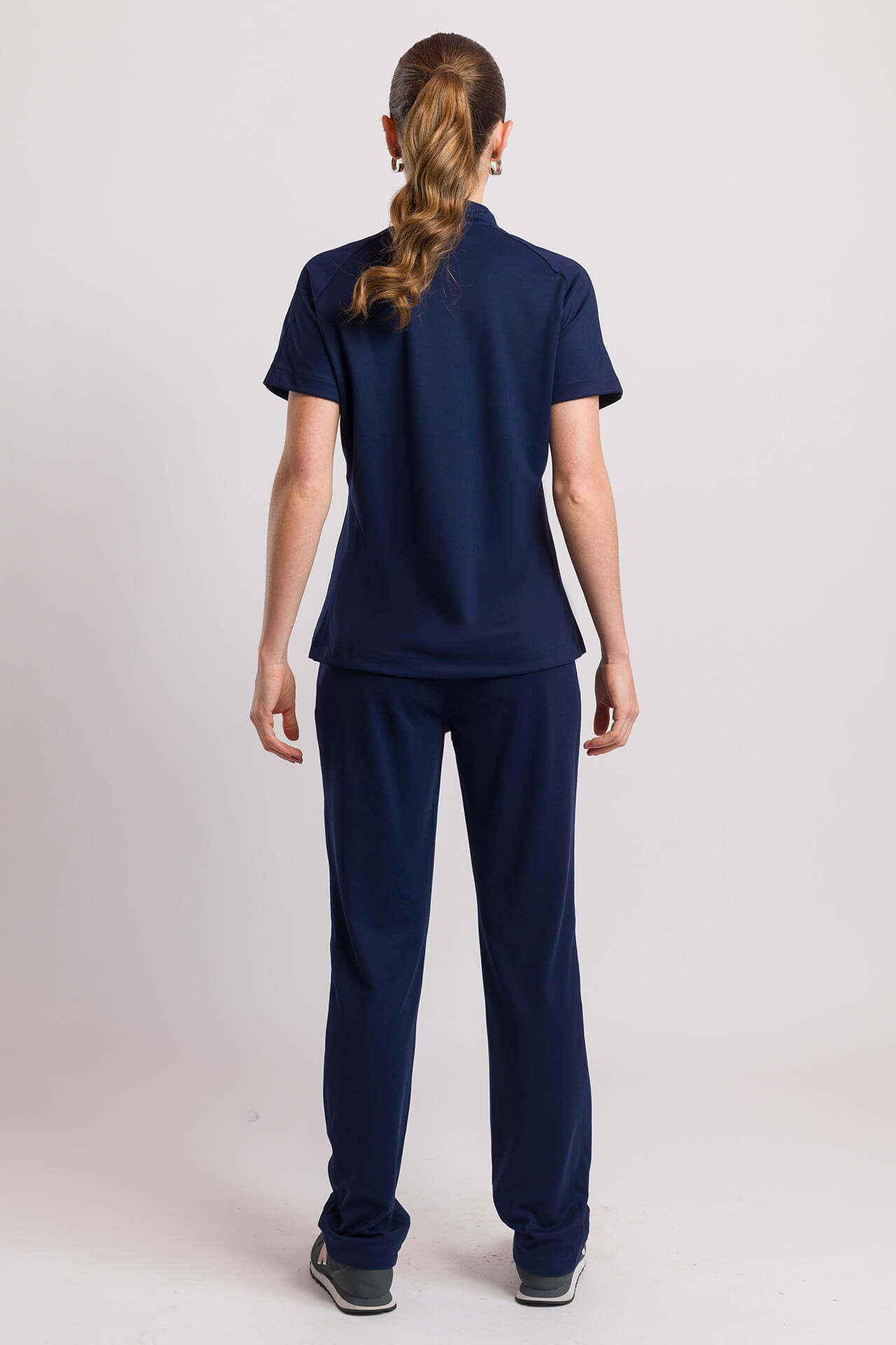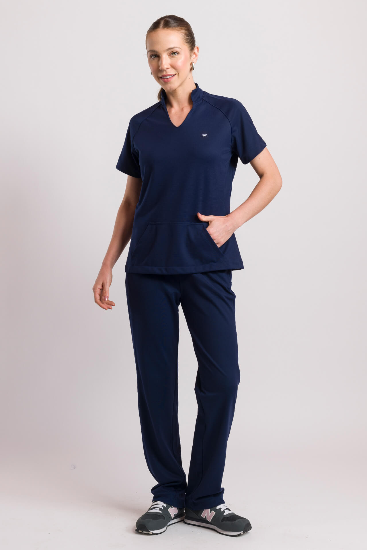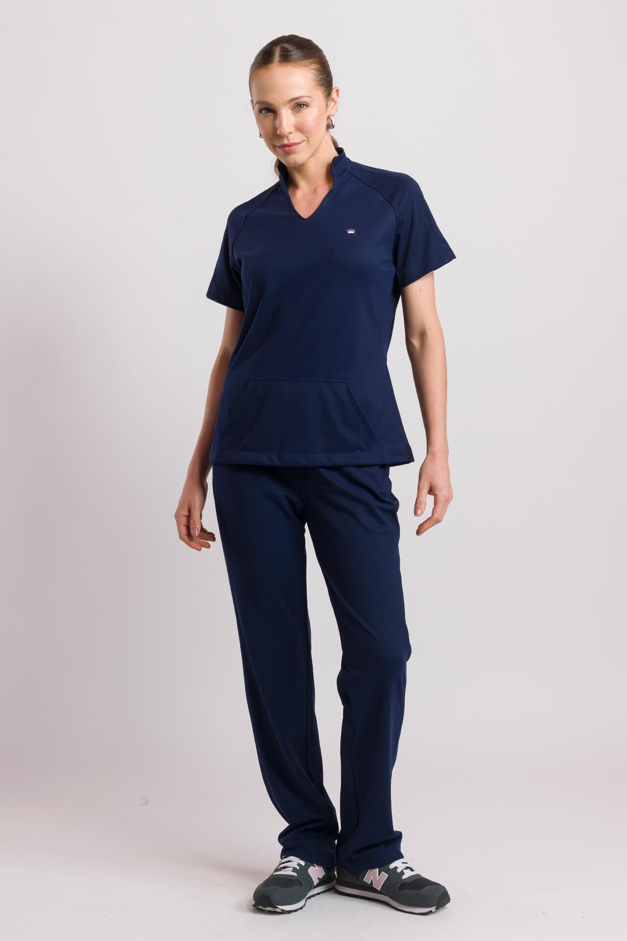 El Ambo Marta tiene un diseño deportivo, con mangas raglán, escote en pico, cuello sacerdote, bolsillo canguro, pantalón recto con cinturilla elástica y bolsillos laterales.