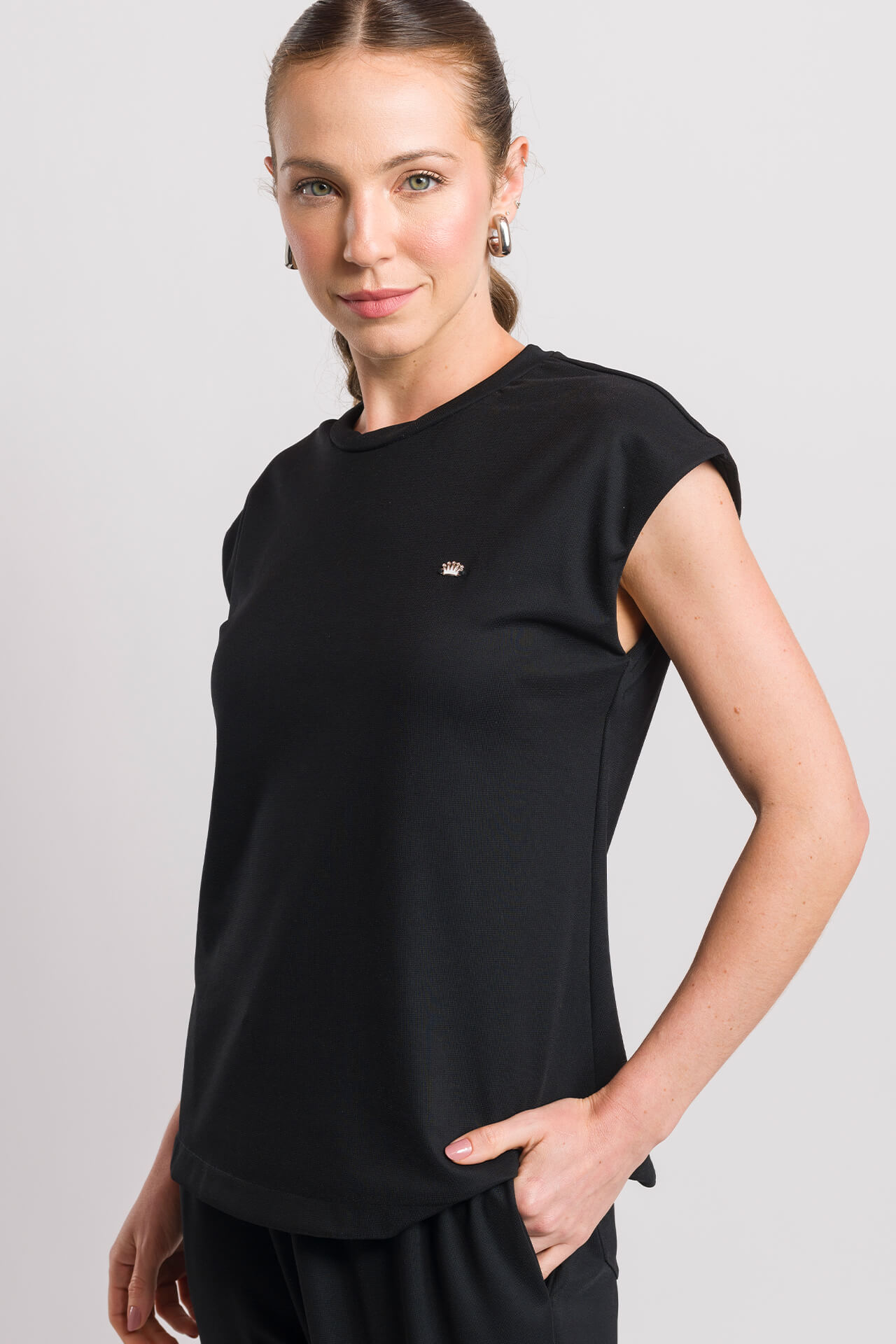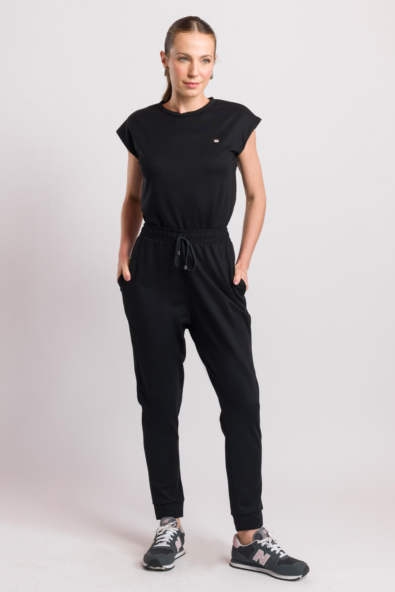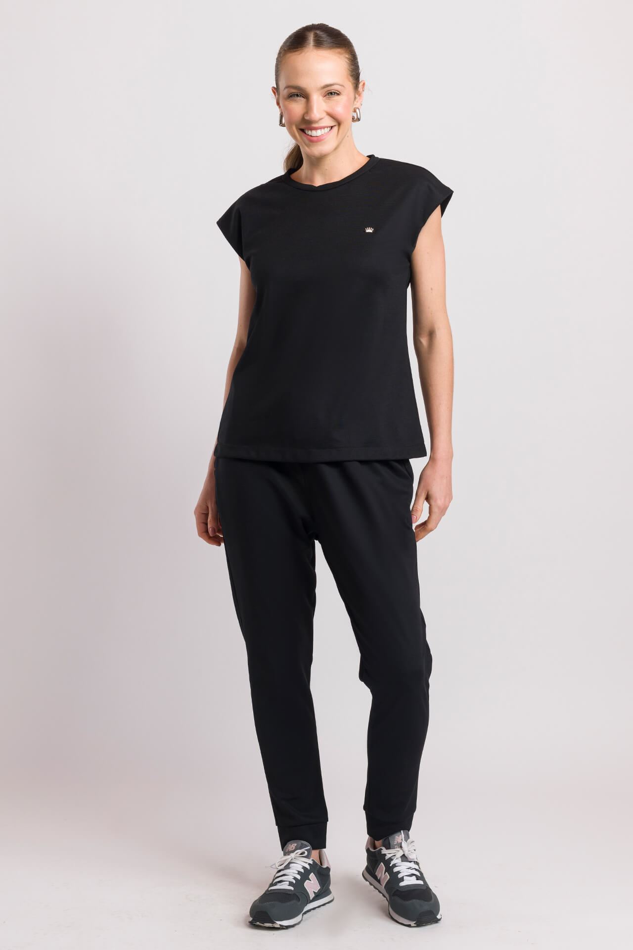 El pantalón presenta un corte ceñido al cuerpo con una cinturilla elástica ancha para mayor comodidad y cordones ajustables con tiras metálicas en los dedos para un toque de estilo. La camiseta presenta un diseño moderno con mangas estilo camiseta sin mangas y cuello redondo, lo que garantiza un look sofisticado ideal para cualquier ocasión.