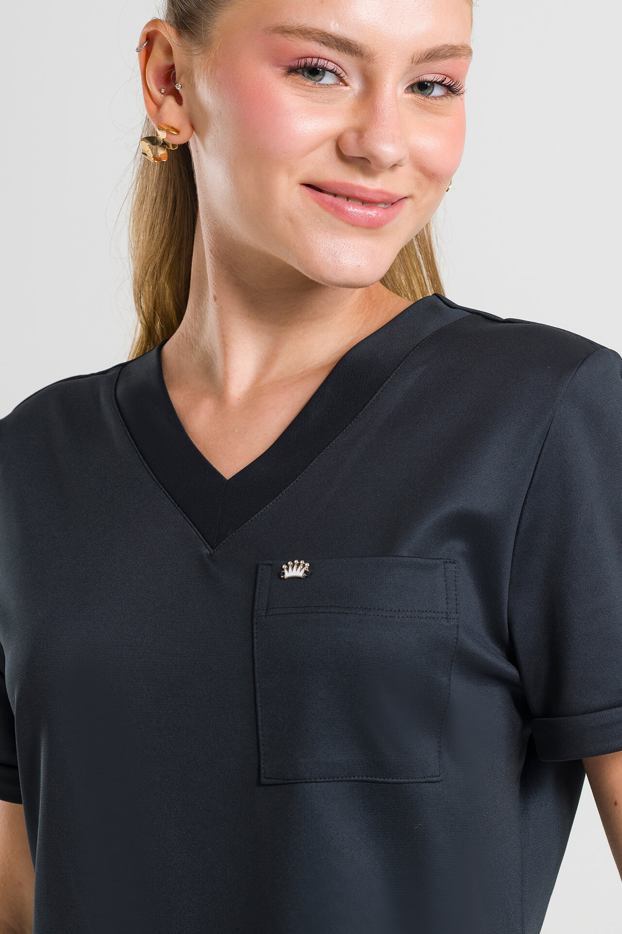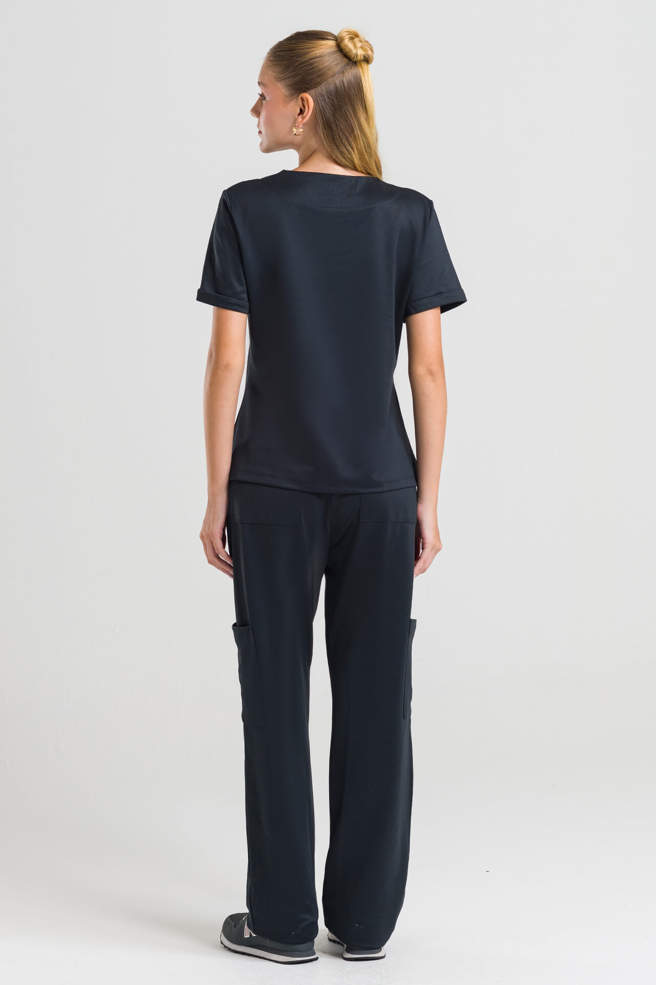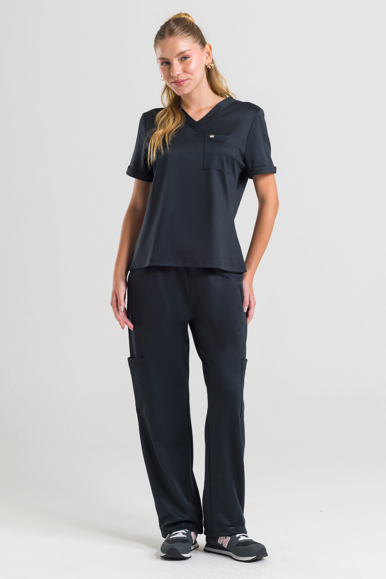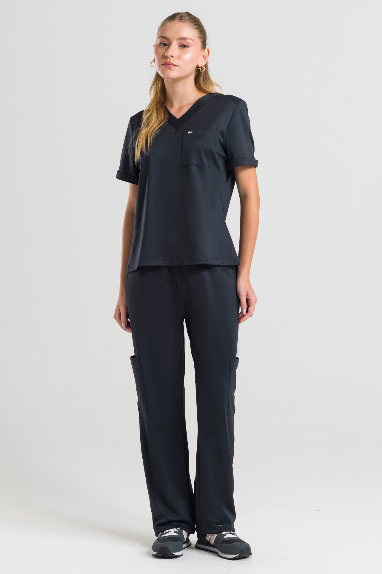 La blusa con escote en V, mangas vueltas y bolsillo lateral añaden encanto y practicidad adicionales. Los pantalones, con cinturilla elástica y bolsillos laterales, ofrecen un ajuste cómodo y funcionalidad para tu rutina. Con una tela de fácil cuidado, que hace más fácil el mantenimiento, y un ajuste holgado, este uniforme es ideal para quienes valoran el estilo sin sacrificar la movilidad.