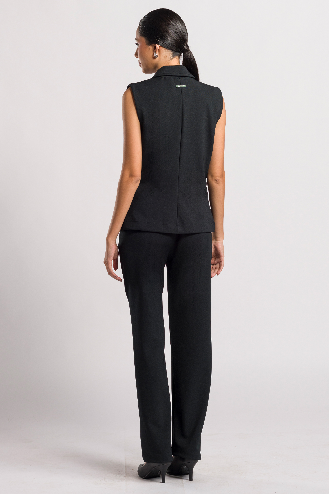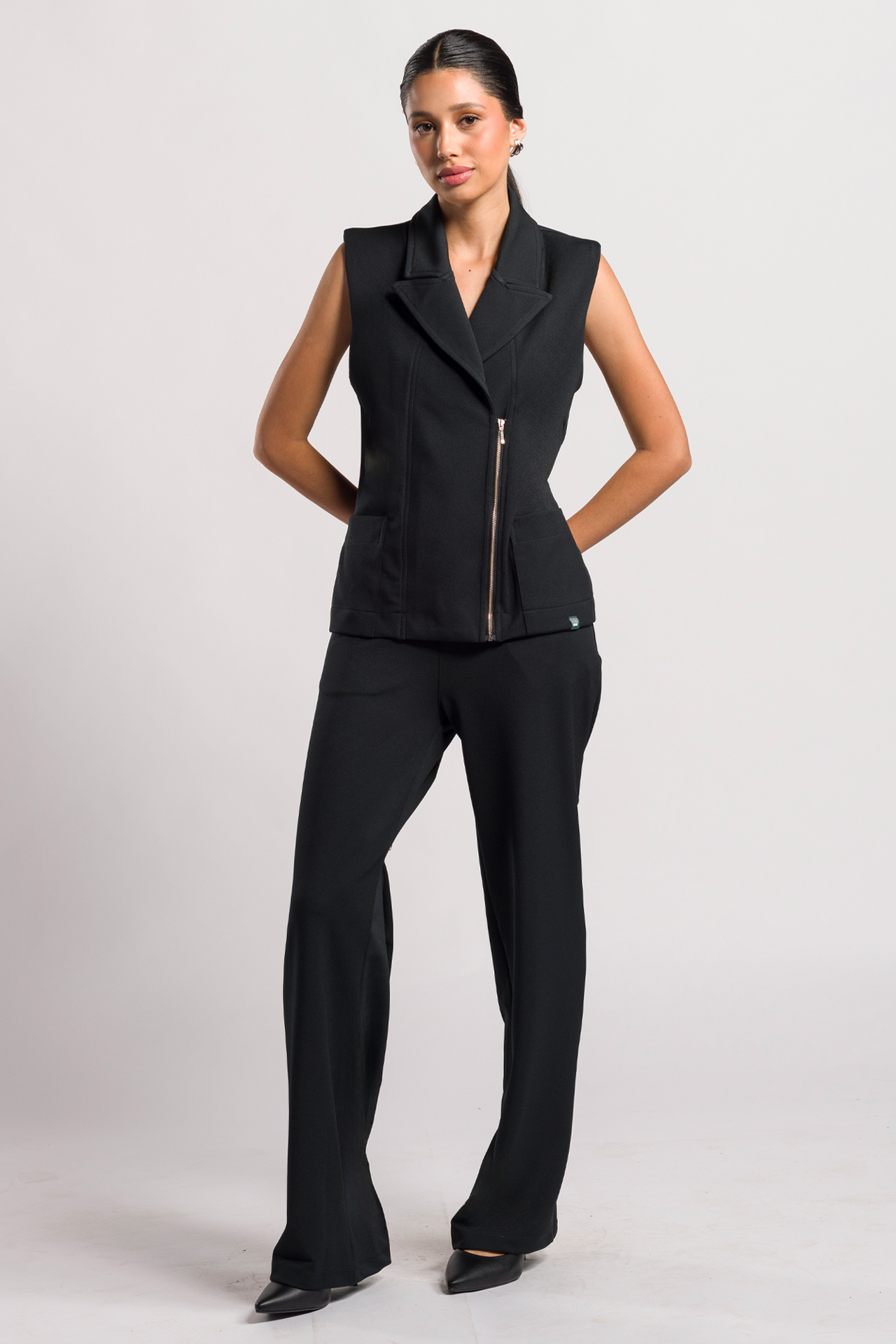 El chaleco cuenta con una cremallera frontal desmontable, un elegante cuello deportivo, un escote ligeramente cruzado y bolsillos delanteros, aportando practicidad y estilo. El pantalón tiene un corte recto, con elástico en la espalda, bolsillo inclinado, falso delantero y cinturilla con trabillas para cinturón, asegurando un ajuste perfecto y comodidad durante todo el día.