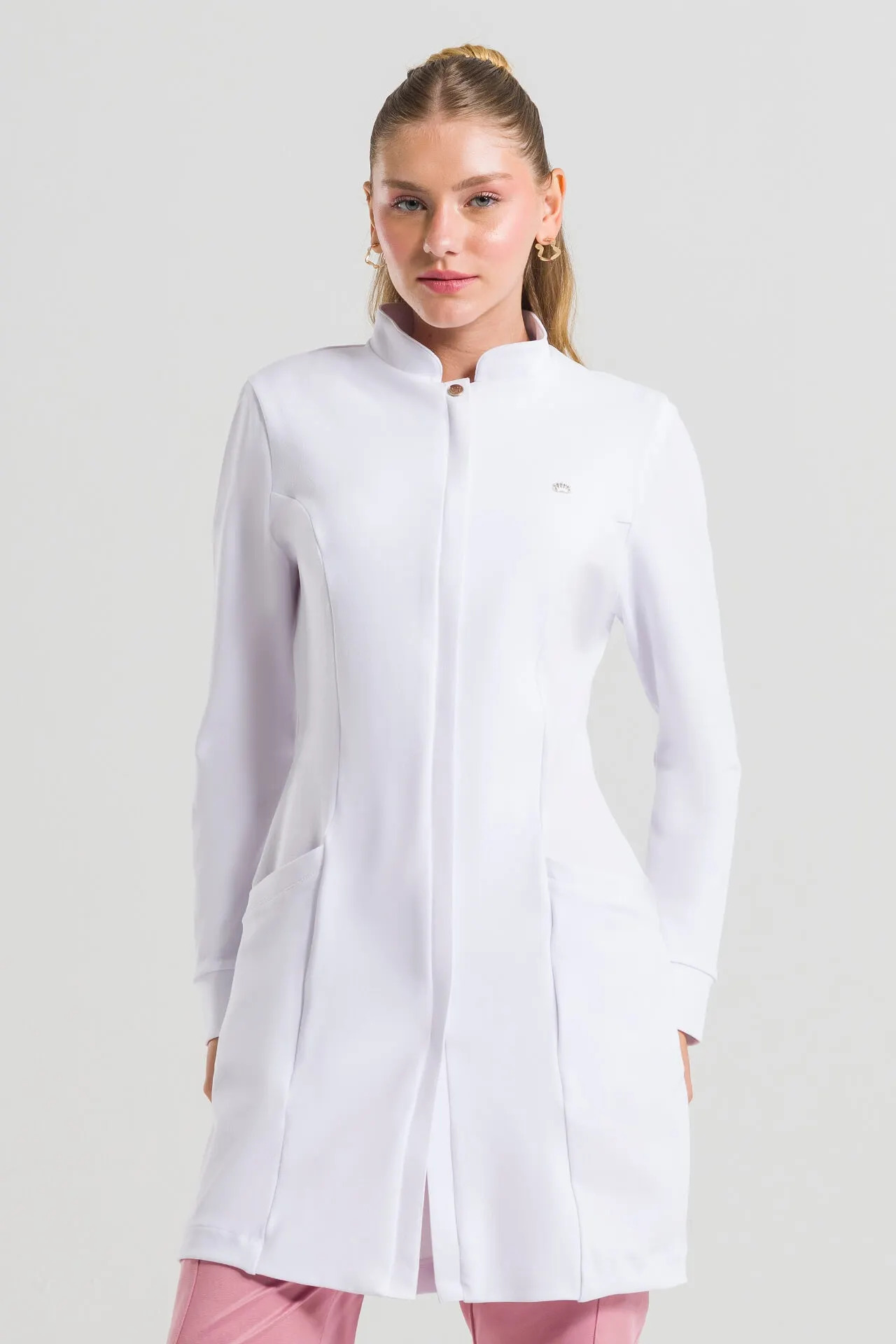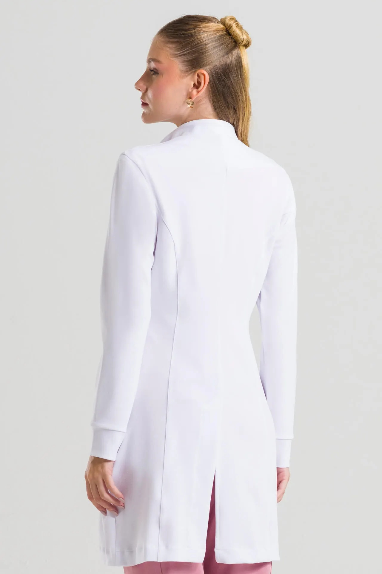 Bata de Laboratorio Mujer Confort, confeccionada en 96% poliéster y 4% elastano, combina tecnología y practicidad para el uso diario. El modelo presenta un cuello sacerdote con cortes modernos, bolsillos laterales funcionales y un cierre de cremallera cubierto con un botón en el escote, proporcionando un aspecto limpio y sofisticado.