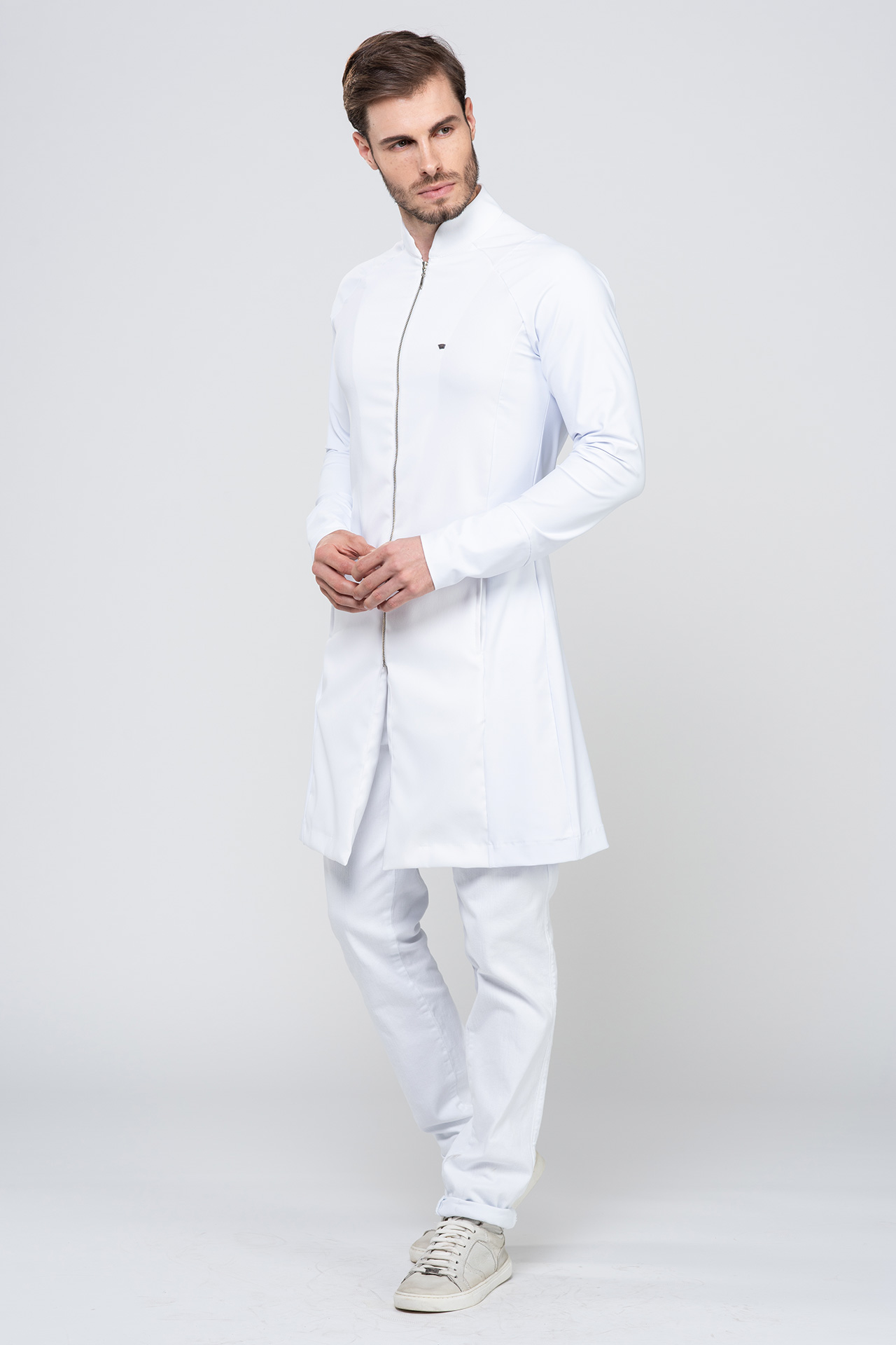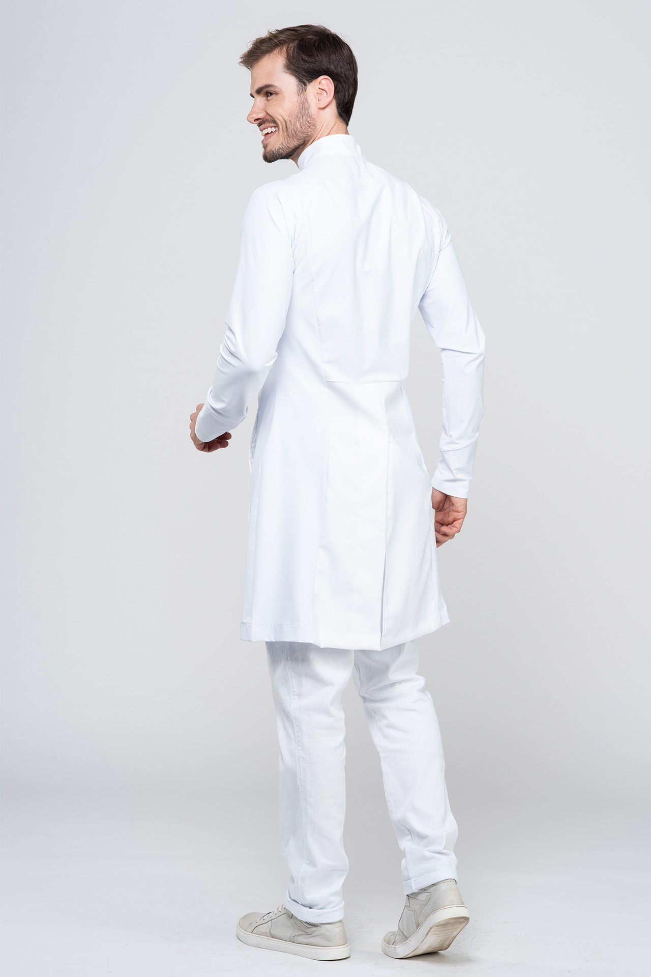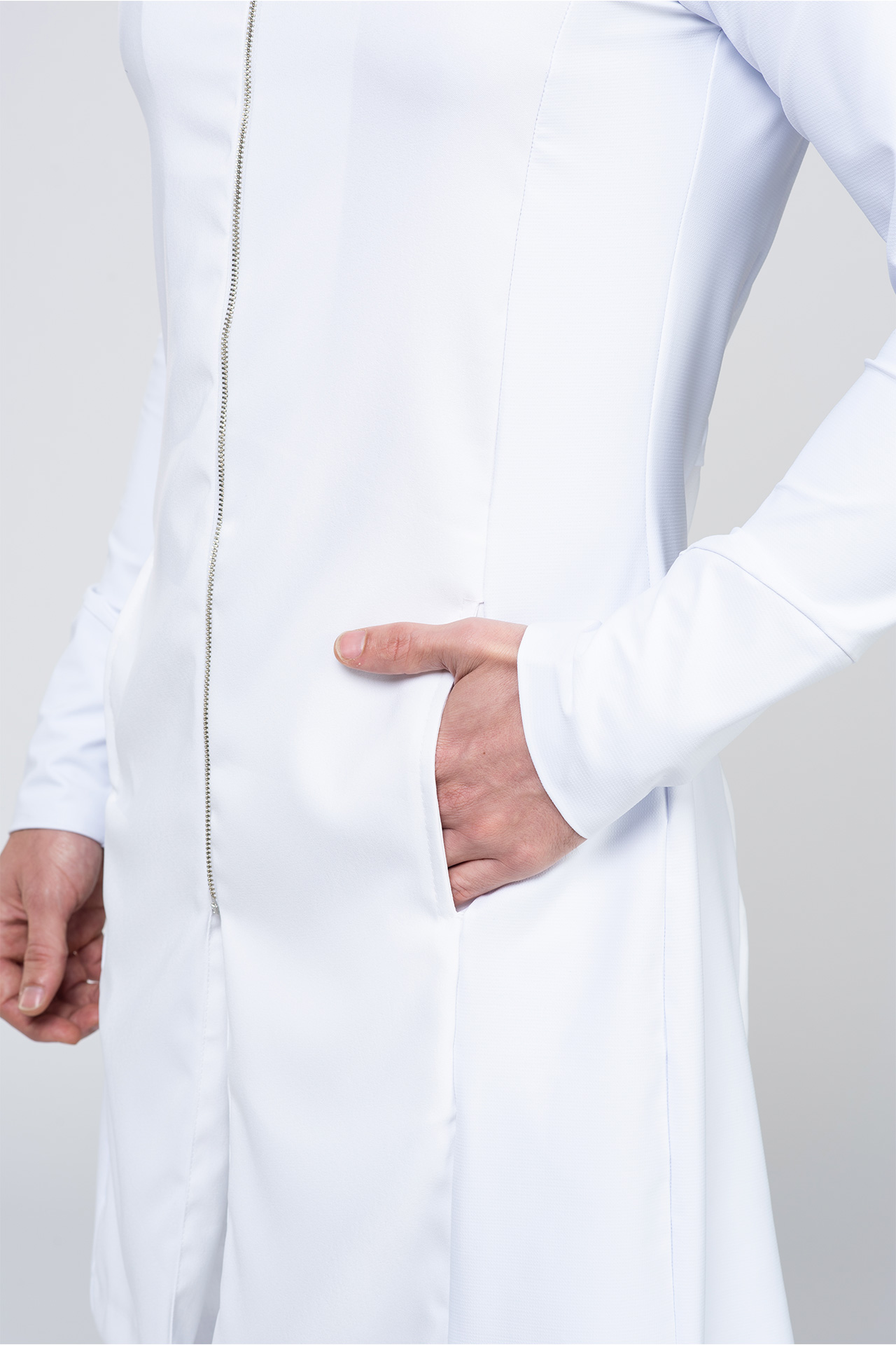 El diseño moderno se complementa con el cuello de sacerdote y el cierre de cremallera, que juntos brindan un aspecto contemporáneo y profesional, ideal para médicos, dentistas, fisioterapeutas y otros profesionales de la salud que buscan una pieza funcional y elegante para el trabajo.