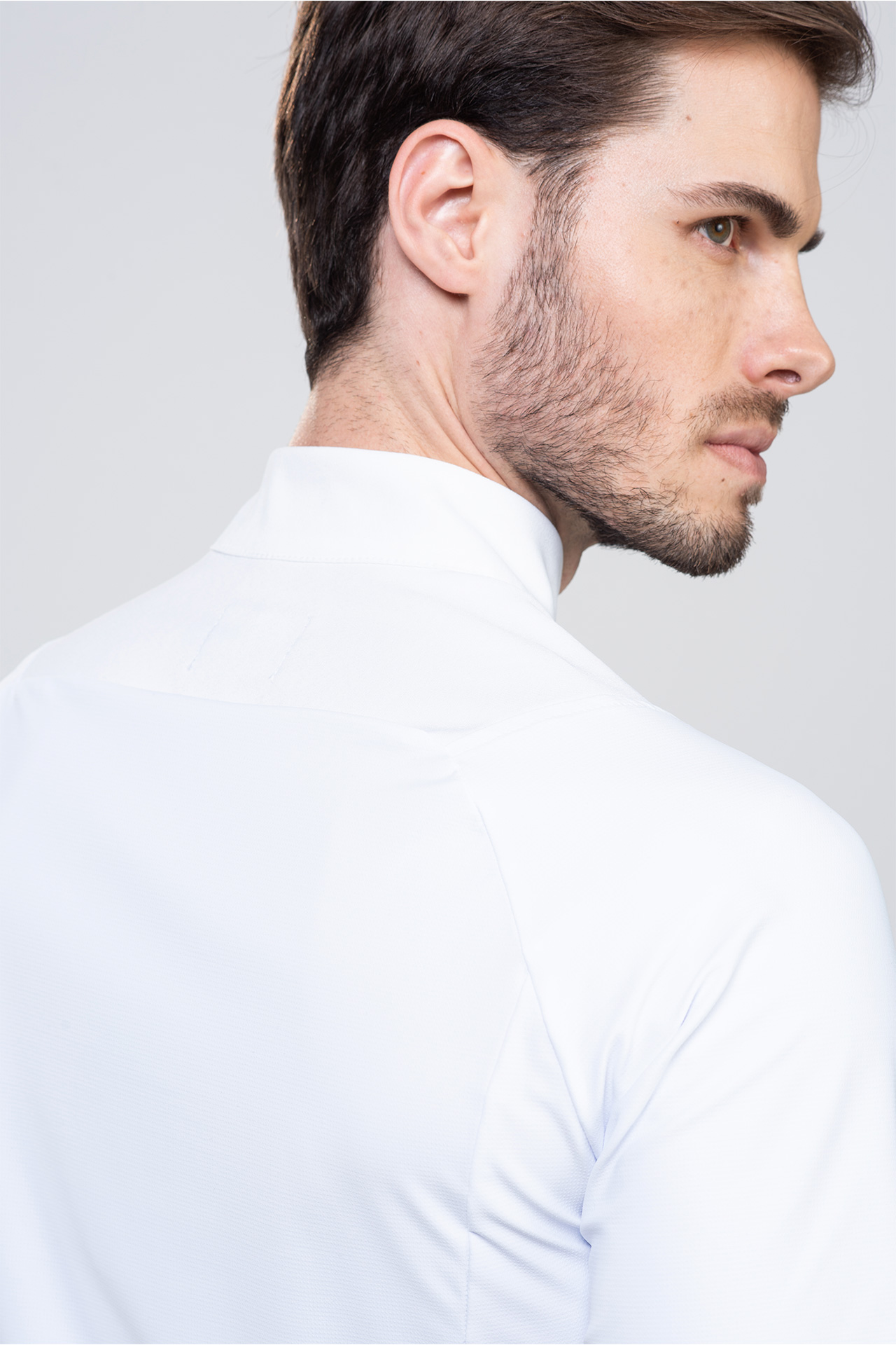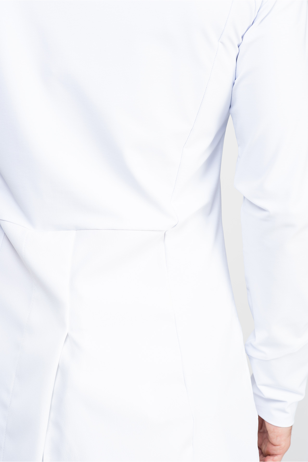 Esta bata está confeccionada con elastano de primera calidad y un tejido tecnológico en la espalda y los brazos, similar al utilizado en ropa de alto rendimiento, que ofrece movilidad superior y confort térmico. Este innovador tejido activa la circulación sanguínea y regula la temperatura corporal, garantizando una frescura constante durante todo el día.